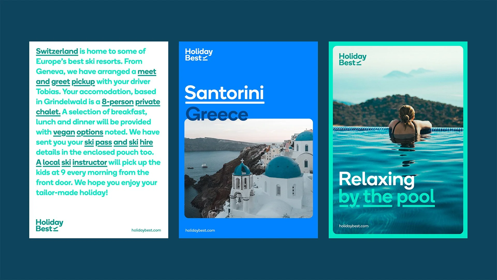 To achieve this, a vibrant colour palette reminiscent of the Mediterranean locations Holiday Best ventured to was introduced. This palette conveyed a fresh feel and an open atmosphere, enabling the brand to stand out from other package holiday providers while also comfortably fitting within the market. Ensuring that photography showcased a narrative customers could envision themselves experiencing was crucial; it needed to feel natural, honest, and unposed. Through typography and copy, the brand’s personality was allowed to shine, utilising a rounded sans-serif as their brand font. This choice of font conveyed an approachable character and the sense of enjoyment a holiday can bring.